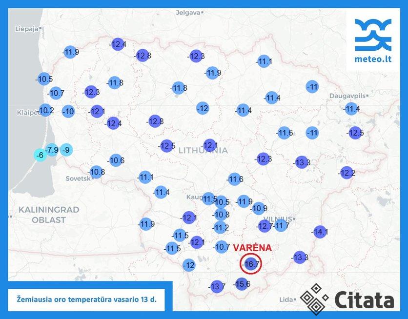 2025 m. vasario mėn.: 13 d. Varėna -16,7 °C.