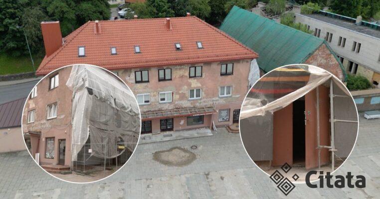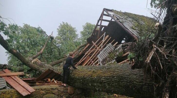 Panevėžio rajone dėl stiprios audros ant pastato užvirto didžiulis medis. Pastatui padaryti didžiuliai nuostoliai –...