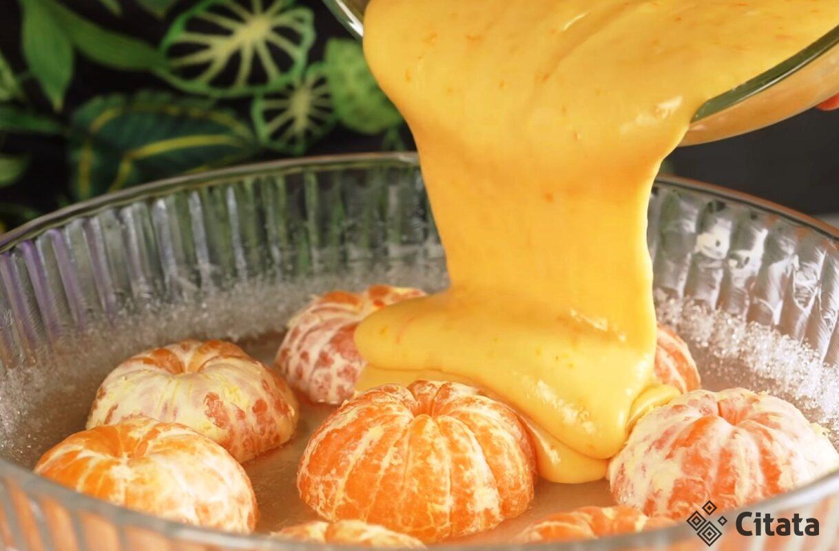 ant dugno sudėkite mandarinų puseles pjautine puse žemyn. Poros mandarinų žievelę sutarkuokite smulkia tarka, į ją įmuškite kiaušinius ir druską, suplakite
