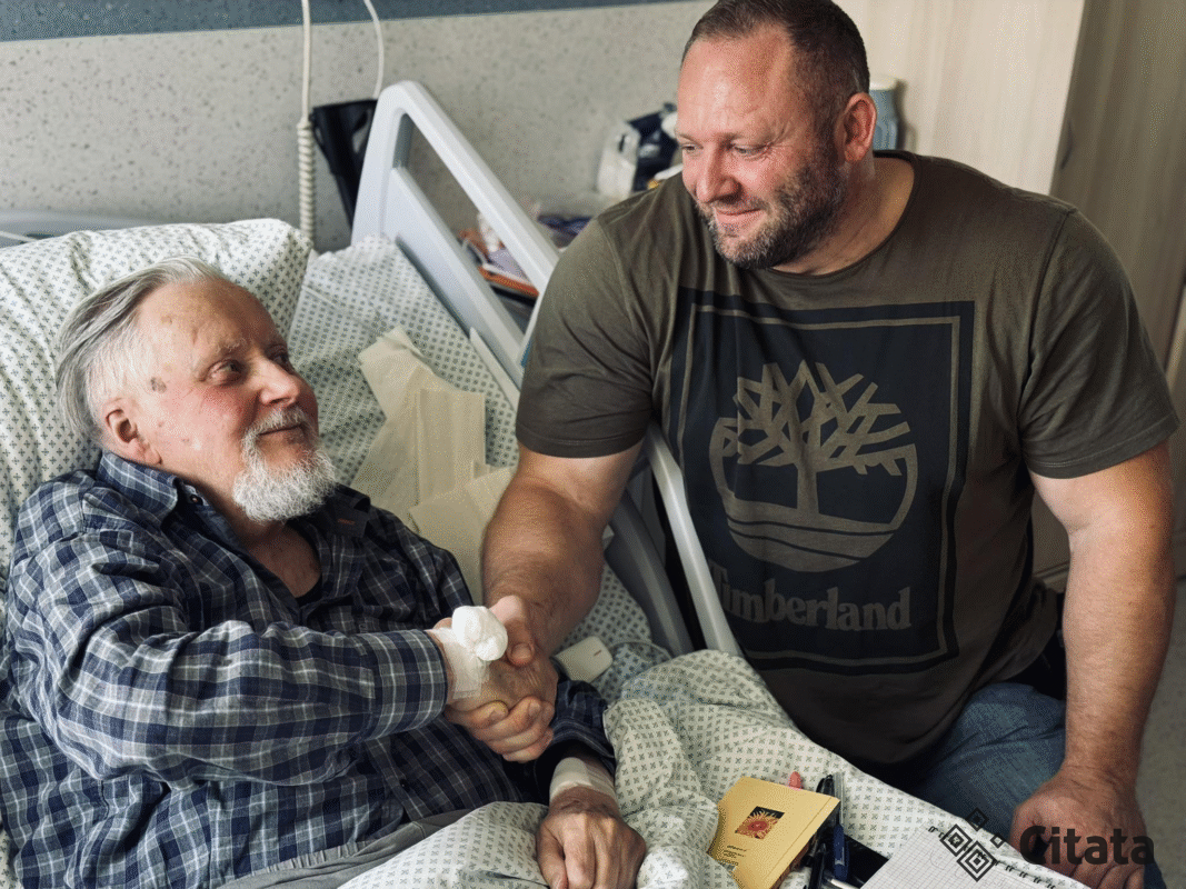 Šeštadienio vakarą Vytautas Landsbergis savo feisbuko puslapyje paviešino nuotrauką, kurioje užfiksuotas gulintis ligoninėje. Šalia – jį lankantis galiūnas, Europos čempionas Dainius Repšys.