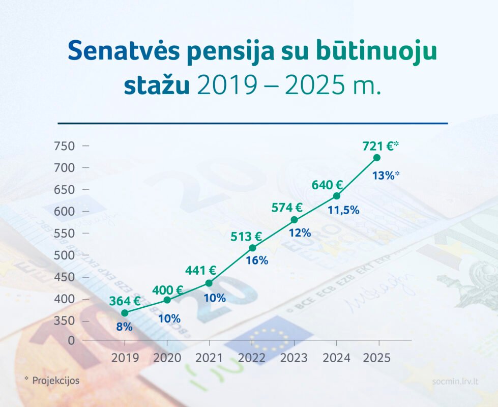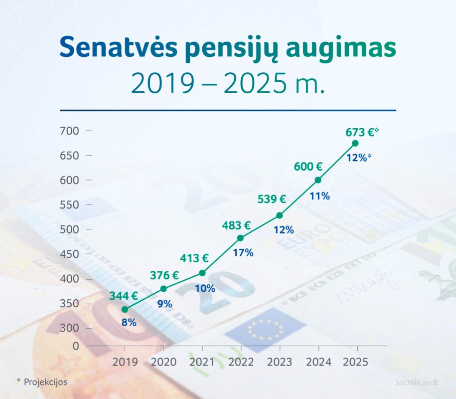 2025 m. vidutiniškai pensijų didėjimas sieks 12 proc. ir išlaikys visos kadencijos pensijų augimo tempą, kai pensijos indeksuojamos dviženkliu procentu. Vidutinė senatvės pensija nuo 2025 m. pradžios ūgtels apie 73 eurais ir pasieks 673 eurus, o vidutinė senatvės pensija tiems, kurie turi būtinąjį stažą, augs 81 euru ir pasieks 721 eurą.