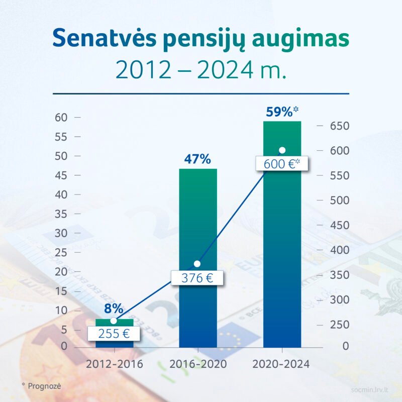 2024 m. laukiama, kad vidutinė senatvės pensija pasieks 600 eurų. Lyginant su 2023 m., vidutinė senatvės pensija padidėjo 61 euru, o vidutinė senatvės pensija su būtinuoju stažu padidėjo 66 eurais ir siekia 640 eurų.
