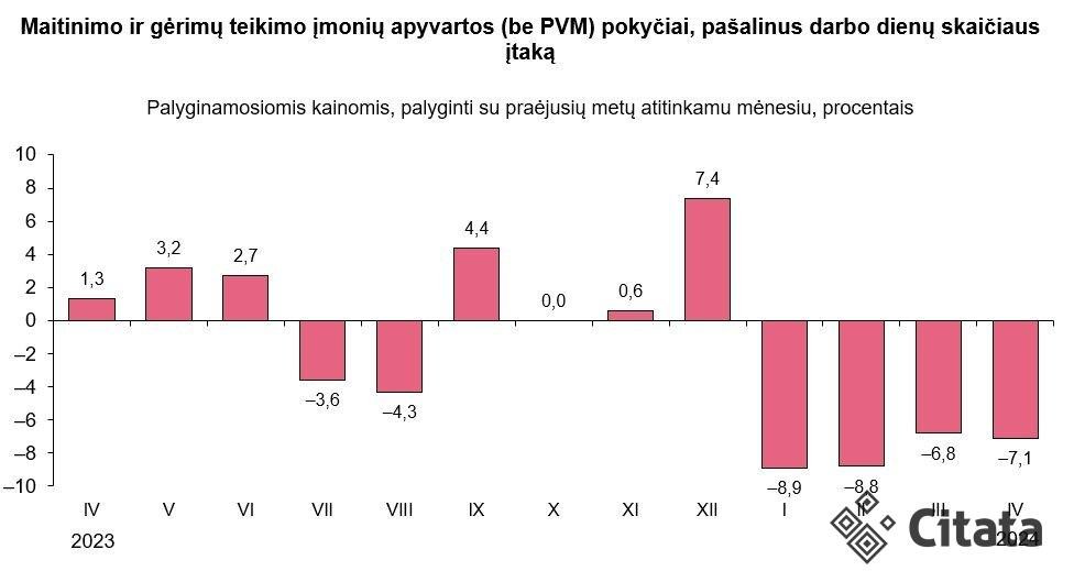 Jos duomenimis, 2024 m. balandį palyginti su 2023 m. balandžiu, maitinimo ir gėrimų teikimo įmonių apyvarta palyginamosiomis kainomis sumažėjo 7,1 proc.