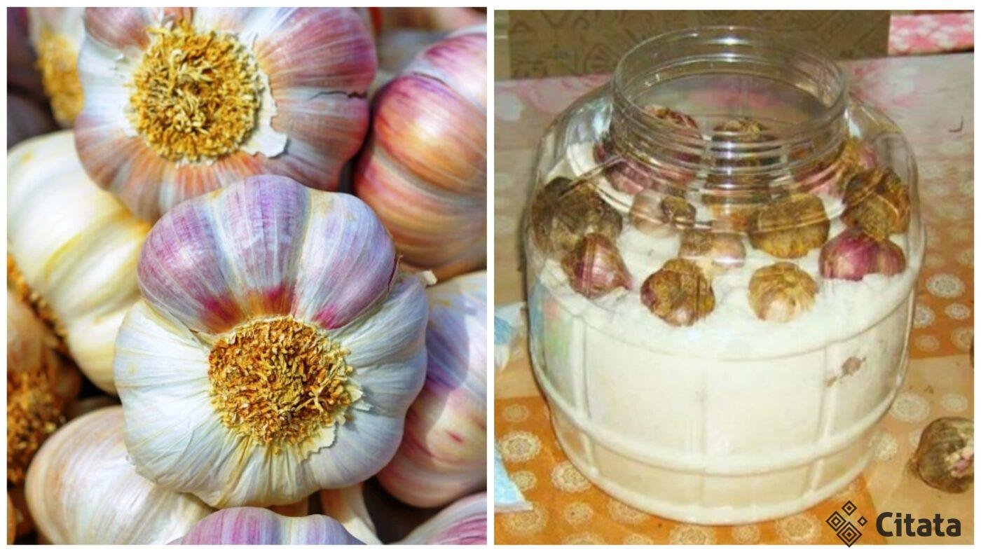 Nulupkite česnako galvutes nuo odelės – palikite paskutinius, ploniausius sluoksnius ir sudėkite juos į sausą stiklainį, kiekvieną sluoksnį užpildydami akmens druska. Druska šiuo atveju yra natūralus konservantas, neleidžiantis supūti ir išsaugantis visas česnako savybes. Galite užpildyti pelenais arba pjuvenomis, o pats viršutinis sluoksnis turėtų būti bent 2 cm storio.