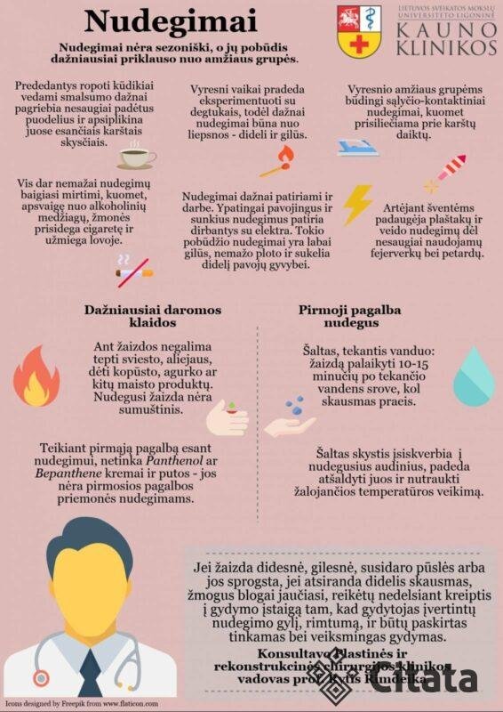 Gydytojas taip pat priminė, kad namuose savarankiškai galima gydyti tik nedidelius (I–II laipsnio), kurie apima iki 1 proc. kūno paviršiaus ir nesukelia didelio skausmo. Pirmojo laipsnio nudegimais laikomi tie, kurie sukelia tik odos paraudimą ir išsausėjimą. O toks nudegimas praeina per 3–7 dienas. 1 proc. kūno plotas yra maždaug delno dydžio plotas.