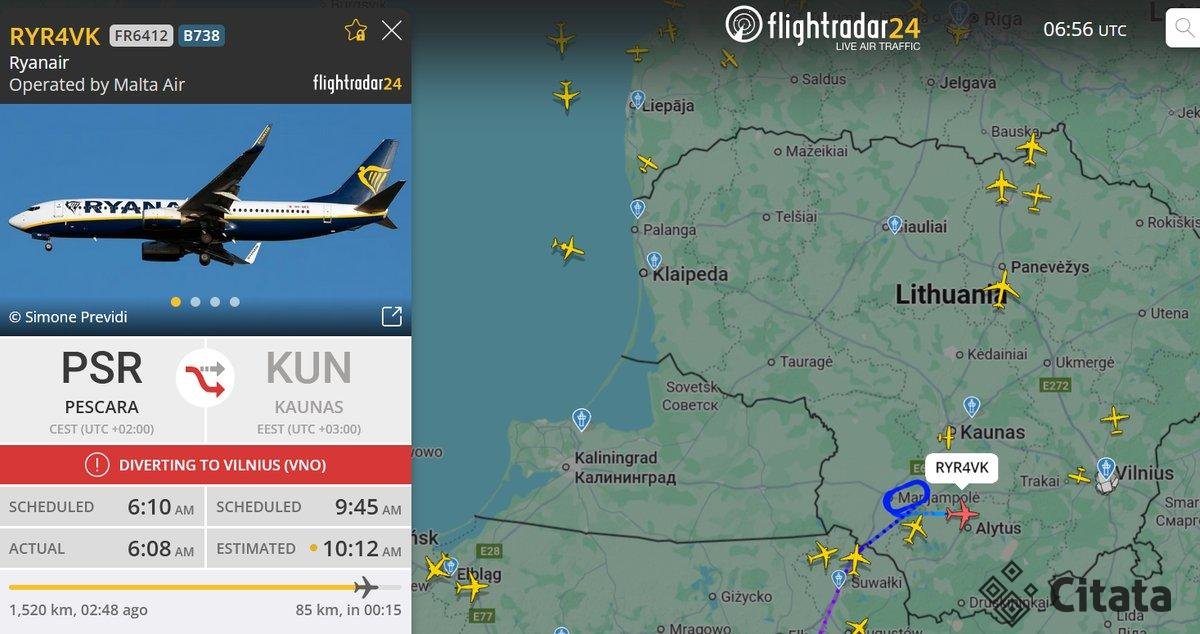 Kitas „Boeingas“ – airių kompanijos „Ryanair“ lėktuvas – skrido iš Italijos Peskaros į Kauną, tačiau apsukęs keletą ratų netoli Marijampolės, buvo nukreiptas į Vilnių.
