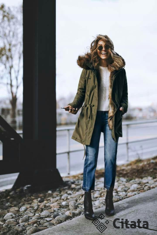 Antitendencija : ilgos chaki spalvos parkos su dideliu kailiu palei gobtuvo kraštą.