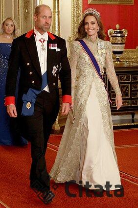 Be to, suknelė labai ryškiai kontrastavo su Velso princesės Kate aukso spalvos žėrinčia rankų darbo nėrinių suknele, sukurta dizainerės Phillipos Lepley. Prie suknelės princesė priderino savo mėgstamiausią aksesuarą – „Cambridge Lover`s Knot“ diadema, kurią mėgo ir velionė Kate anyta Velso princesė Diana. Kate segėjo auskarus, priklausiusius karalienei Elizabeth II.