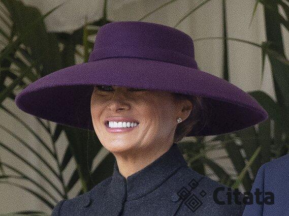 Vizito Londone metu ji nustebino griežto kirpimo „Christian Dior Haute Couture“ kostiumėliu ir savotišku skiriamuoju Melanios bruožu tapusia pusę veido dengiančia plačiakrašte tamsios slyvų spalvos skrybėle, derančia prie prezidento D. Trumpo kaklaraiščio.
