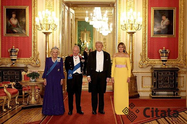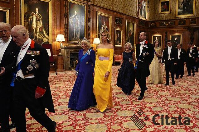 Valstybiniam banketui Vindzoro pilyje ponia Trump pasirinko ryškiai geltoną „Carolina Herrera“ suknelę apnuogintais pečiais (sukurtą Weso Gordono), ją juosė alyvų spalvos juosta-diržas. Įvaizdį papildė masyvūs smaragdų auskarai.