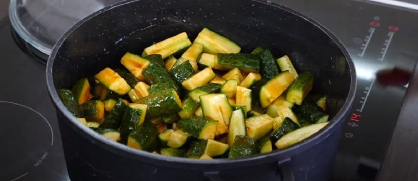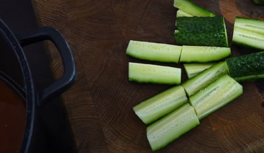 Nuplovę agurkus, nupjaukite galiukus ir išilgai supjaustykite į ketvirčius. Jei taip paruošti agurkai yra per ilgi ir kiltų problemų juos dėti į stiklainį, ketvirčius vis tiek galite perpjauti per pusę. Tada taip paruoštus agurkus sudėkite į marinatą , kurį kartu su agurkais užvirkite. Virkite mišinį uždengę ant silpnos arba vidutinės ugnies apie 25 minutes.