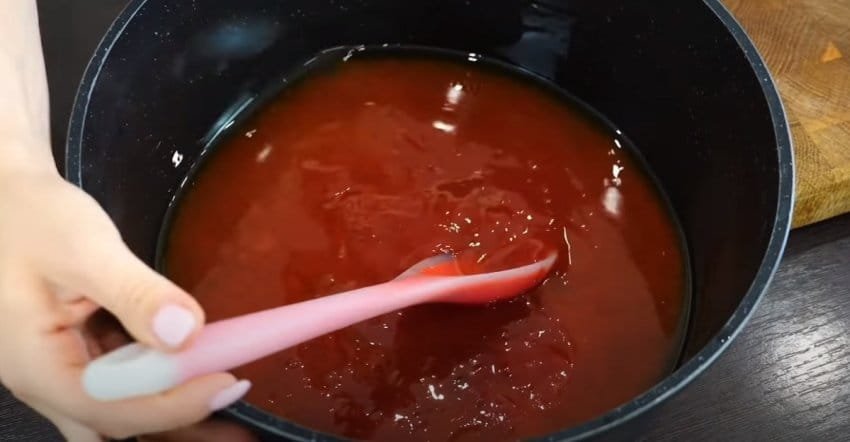 Pirmasis žingsnis yra paruošti marinatą. Į didelį puodą supilkite paruoštą vandenį, actą ir saulėgrąžų aliejų. Tada įpilkite cukraus, manų kruopų, druskos ir kečupo. Viską gerai išmaišykite, kad atskiri ingredientai susimaišytų .