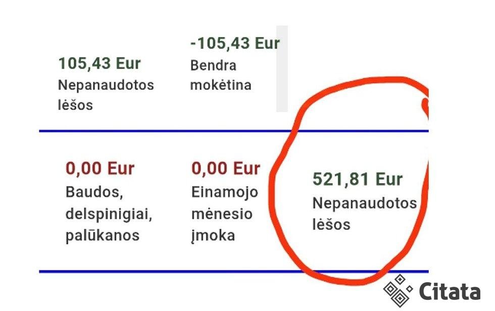 Pvz., viena moteris pasidalijo, kad „nepanaudotos lėšos“ pas ją rodomos 105,43 euro, o bendra mokėtina suma yra su minusu, t. y. –105,43 euro.