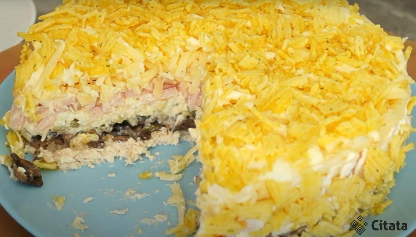 stambia tarka, sumaišykite su šaukštu majonezo ir sudėkite ant agurkų sluoksnio, taip pat patepkite majonezu. Smulkiai supjaustykite kumpį ir uždėkite jį ant kiaušinių sluoksnio