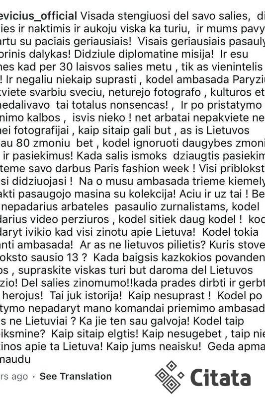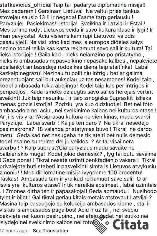 „Negaliu niekaip suprasti, kodėl ambasada Paryžiuje nepakvietė svarbių svečių, neturėjo fotografo, kultūros atstovai iš viso nedalyvavo – tai totalus nonsensas! Po pristatymo nebuvo nei sveikinimo kalbos, iš viso nieko! Net arbatai nepakvietė, nei istorinei fotografijai – kaip taip gali būti? Aš iš Lietuvos atvežiau 80 žmonių, bet kodėl ignoruoti daugybės žmonių darbą ir pasiekimus? Kada šalis išmoks džiaugtis pasiekimais? Pristatėme savo darbus „Paris Fashion Week“! Visi priblokšti, dalinasi, didžiuojasi! O mūsų ambasada priemė kiemelyje ir per naktį saugojo mašiną su kolekcija! Ačiū ir už tai! Bet kodėl nepadarė arbatos pasaulio žurnalistams? Kodėl nepadarė vaizdo peržiūros? Kodėl tiek daug „kodėl“? Kodėl nepadarė renginio, kad visi žinotų apie Lietuvą? Kodėl tokia miegančioji ambasada? Ar aš ne Lietuvoje? Kuris stovėjo prie bokšto Sausio 13-ąją? Kada baigsis kažkokios povandeninės intrigos?“, – rašė J.Statkevičius.