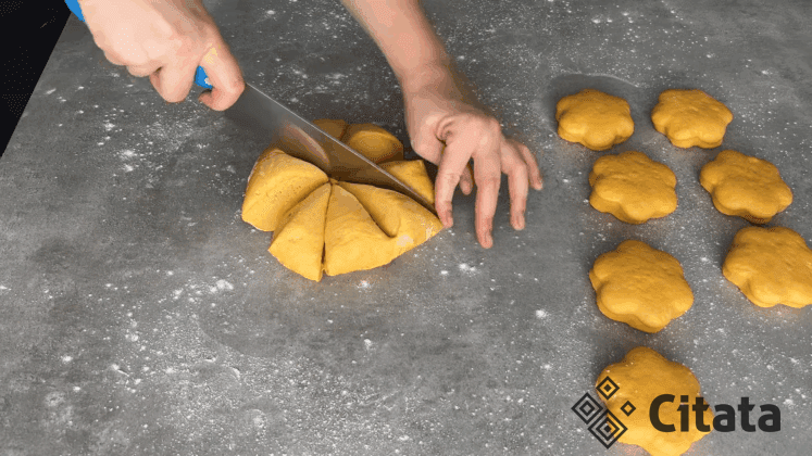 Dubenyje sumaišykite pieną, mieles ir cukrų, leiskite joms suaktyvėti. Įpilkite moliūgų tyrės, įdėkite trynius ir dalį miltų. Minkykite tešlą – galite naudoti virtuvinį kombainą arba daryti tai rankomis.