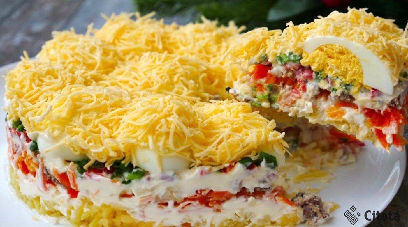 . šeštas sluoksnis – žalieji svogūnai arba prieskoninės žolelės.