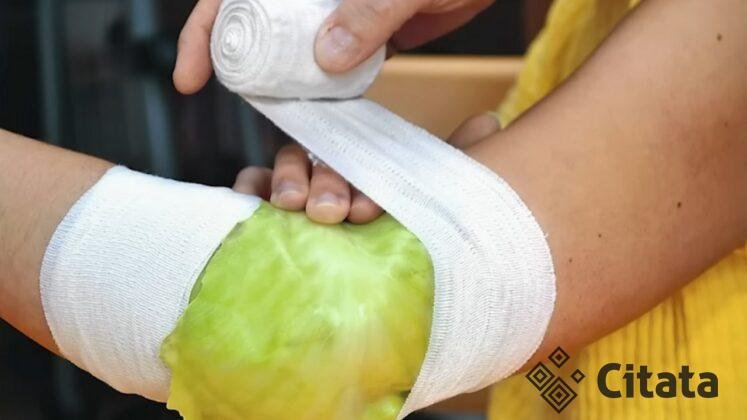 - Uždėkite ant skaudamos vietos. Lapą priglauskite prie sąnario (kelio, alkūnės, peties ar rankos pirštų) ir apvyniokite maistine plėvele ar švariu audiniu.
