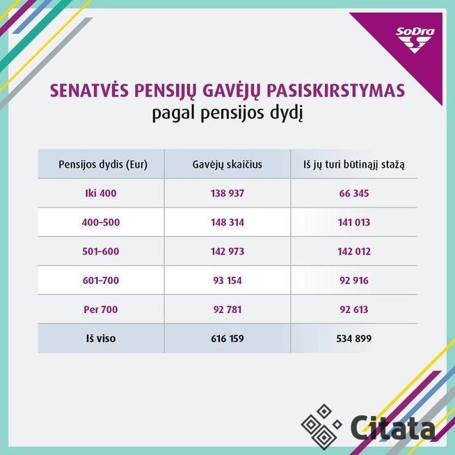 Taigi, iki 400 eurų dydžio pensijas gauna iš viso 138,9 tūkst. gyventojų. Tarp jų yra 66,3 tūkst. tų, kurie yra sukaupę būtinąjį stažą ir 72,6 tūkst. – jo nesukaupusių. Pastarieji dirbo kur kas trumpiau nei pirmieji.