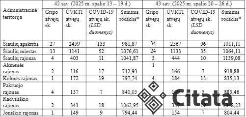 Lentelėje duomenys apie registruotus gripo, ŪVKTI ir COVID-19 ligos atvejus Šiaulių apskrities administracinėse teritorijose.