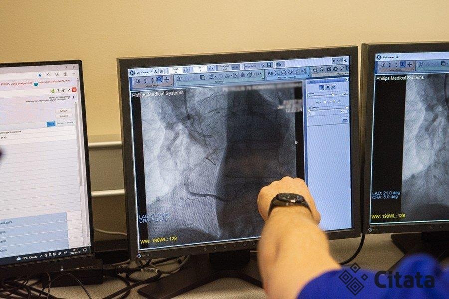Tada per kažkurią arteriją – dažniausiai rankos arba kojos – nukeliaujame iki širdies, įvertiname širdinę kraujotaką ir, jei matome, kad yra susiaurėjimai, kurie trikdo kraujotaką, taikome intervenciją. Priklausomai nuo to, ten yra trombas, krešulys ar plyšusi kraujagyslė, aterosklerotinė plokštelė, išvalome kraujagyslę ir į jos vidų įdedame metalinį stentą-tinkliuką, taip pacientams pagerindami rezultatus“, – pasakoja kardiologas.