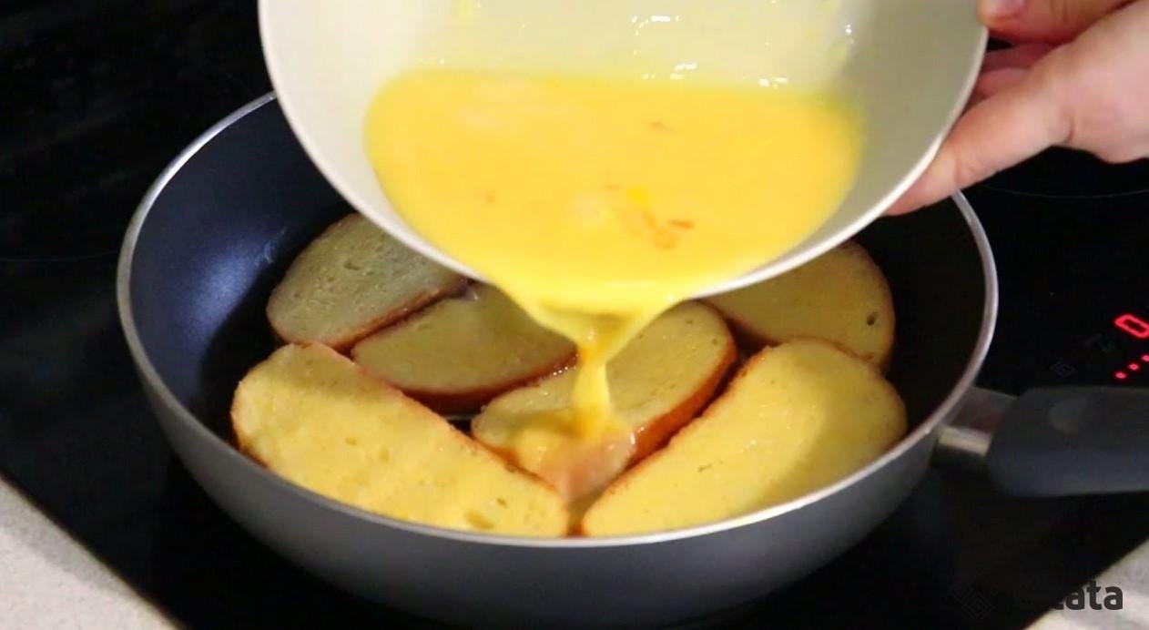 Kiekvieną batono riekelę pamerkite į kiaušinių masę ir dėkite ant keptuvės, visiškai užpildydami indą. Užpilkite likusia kiaušinių mase. Kepkite vieną pusę po dangčiu, kol paruduos, ant mažos ugnies.
