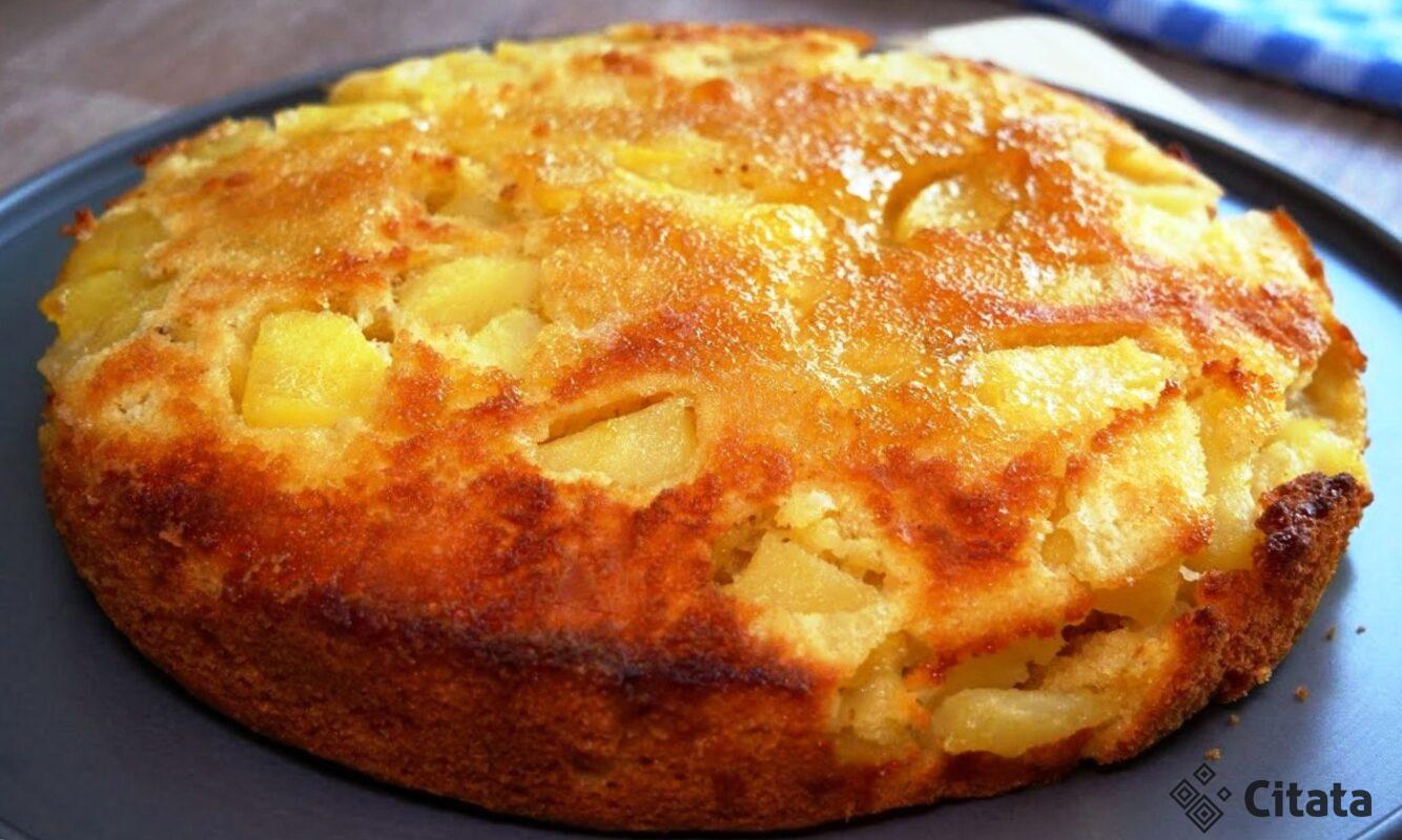 Biskvitas yra drėgnas dėl tešloje esančio sviesto, obuoliai taip pat suteikia pyragui sultingumo ir skonio.