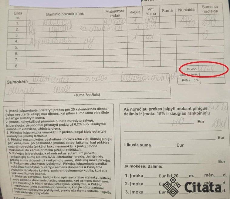 Tik pasirašiusi sutartį moteris suprato, kad 2 metus, kiekvieną mėnesį iš pensijos jai atskaičiuos 50 eurų. Todėl ji kreipėsi į pardavėją dėl sutarties nutraukimo.