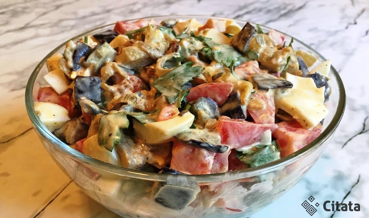 Skanios ir paprastos baklažanų, pomidorų, virtų kiaušinių salotos. Galite patiekti ir ant šventinio stalo.