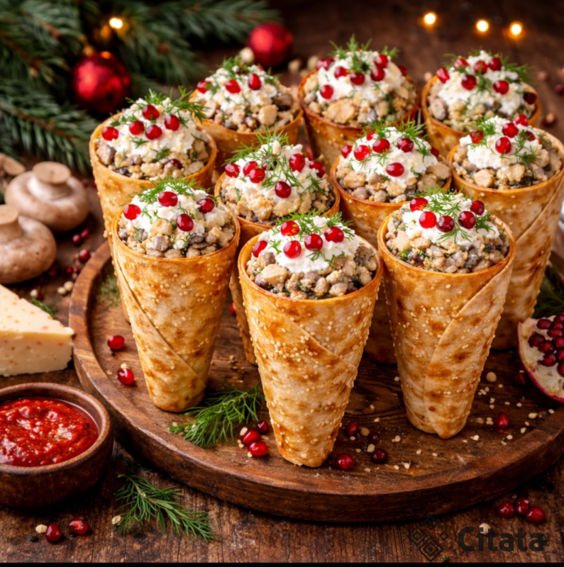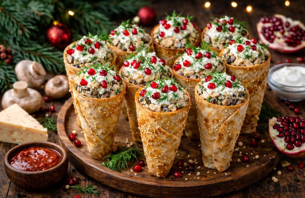 Prieš patiekiant, įdarykite kūgelius įdaru ir papuoškite kreminiu sūriu, krapais ir granatų sėklomis. Traškus apvalkalas ir minkštas, sotus įdaras viduje paverčia šį užkandį tikru hitu.