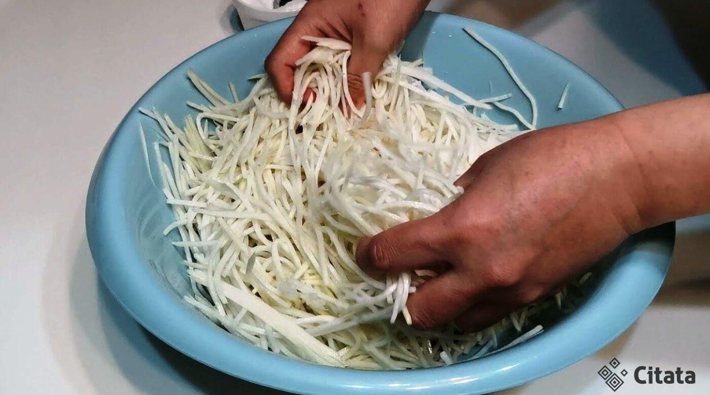 Gaivios ir lengvos, pikantiškos ridikėlių salotos prie plovo ir kitų patiekalų. Pagal skonį įberkite prieskonių ir acto, būtinai gerai pamarinuokite. Geriau naudoti baltuosius ridikėlius – daikonus.