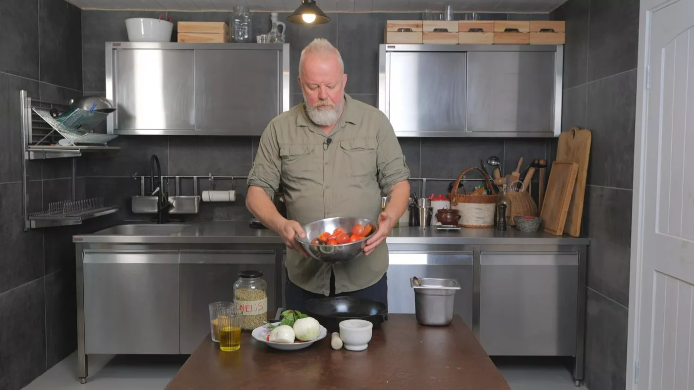 Pirmiausia Vytaras nuims kietesnes pomidorų dalis, supjaustys juos stambiais gabalais, o tuomet subers į kepimo indą drauge su dviem dideliais svogūnais, alyvuogių aliejumi, ruduoju cukrumi, bazilikais bei rozmarinu. Pagal skonį jis pridės ir čili, česnako, pipirų bei druskos.