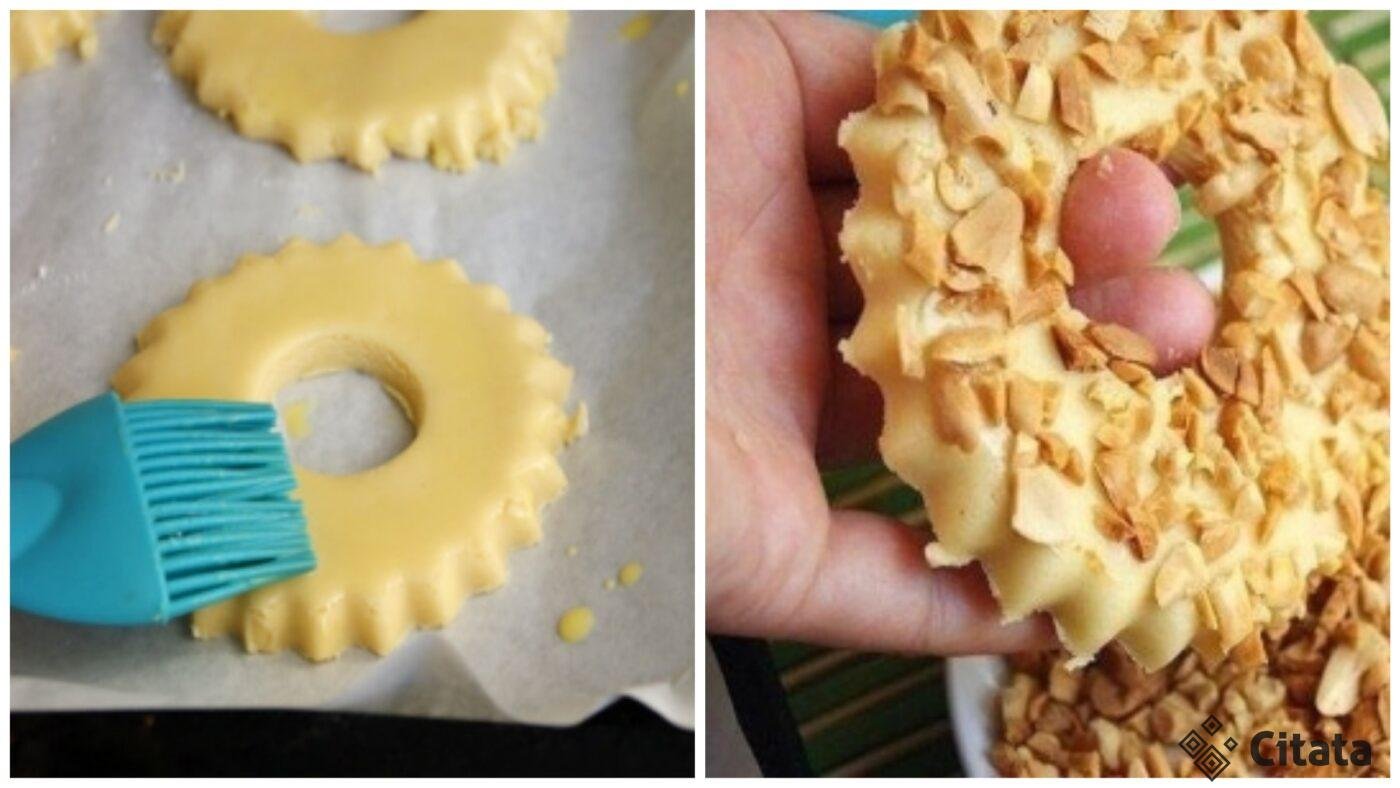 Įmuškite kiaušinio trynį, aptepkite sausainius ir apibarstykite smulkintais riešutais