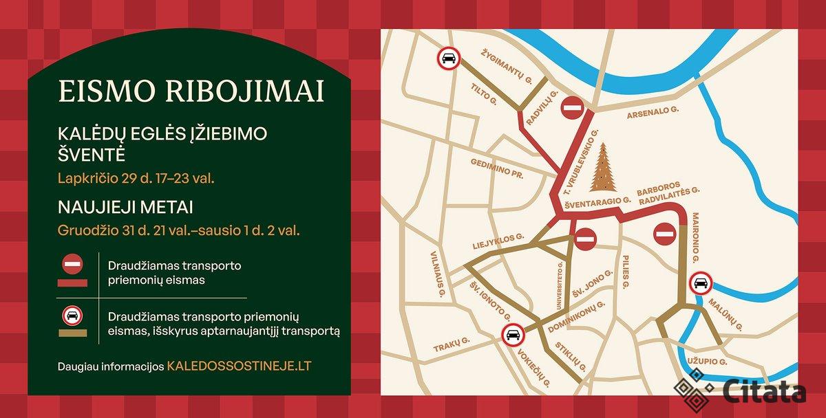 Kalėdų eglės įžiebimo šventės metu, lapkričio 29 d. nuo 17 iki 24 val., Katedros aikštės prieigose bus draudžiamas transporto priemonių eismas T. Vrublevskio, Šventaragio, Barboros Radvilaitės gatvėse, draudžiant į jas įvažiuoti iš šalutinių gatvių.